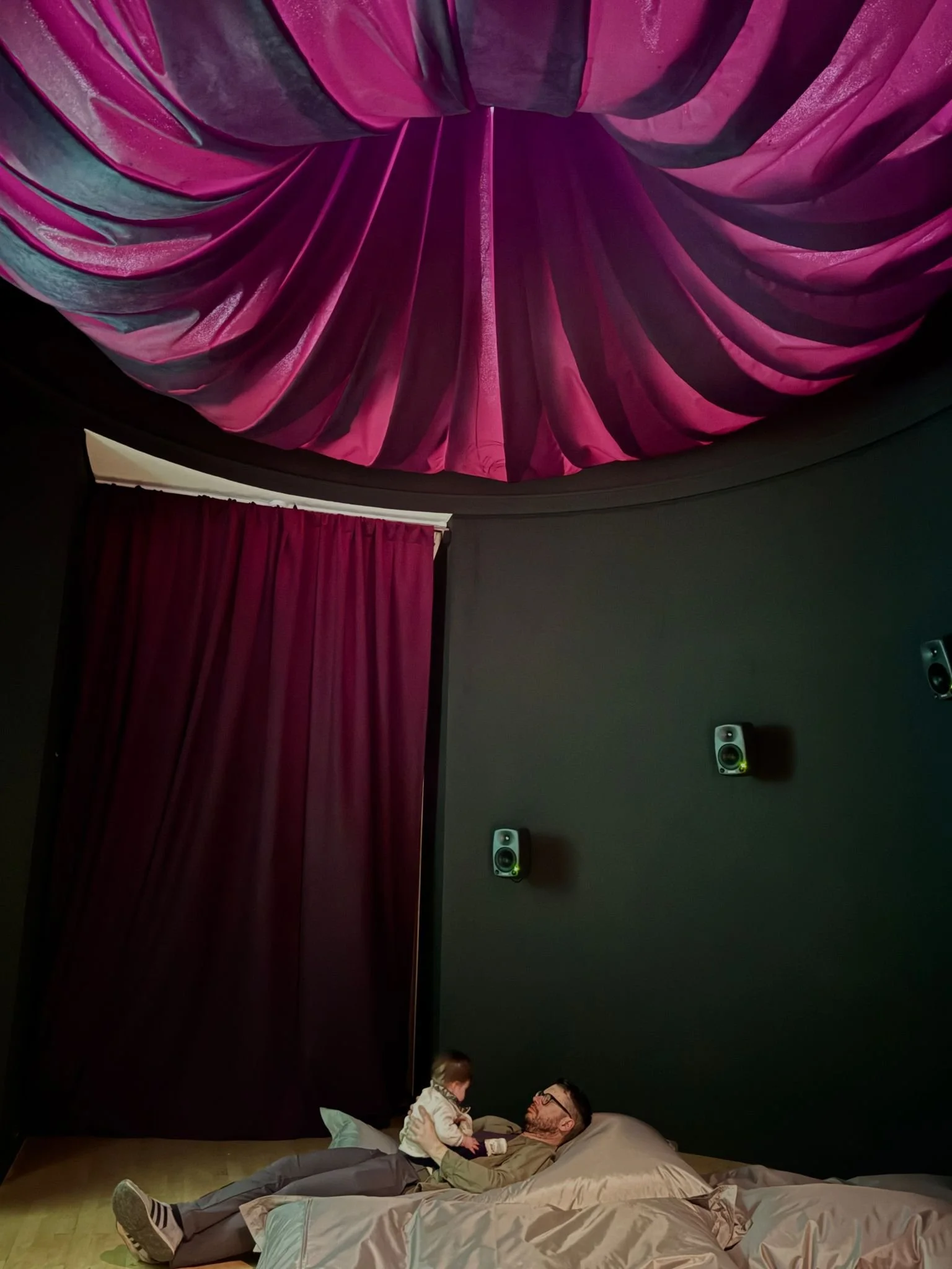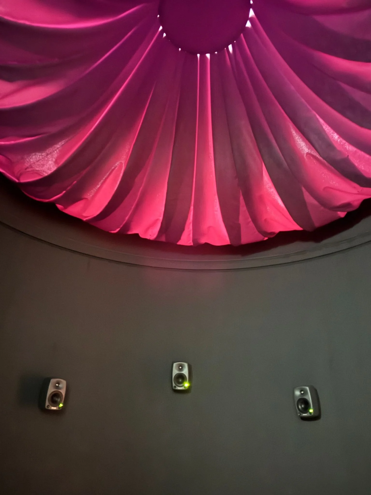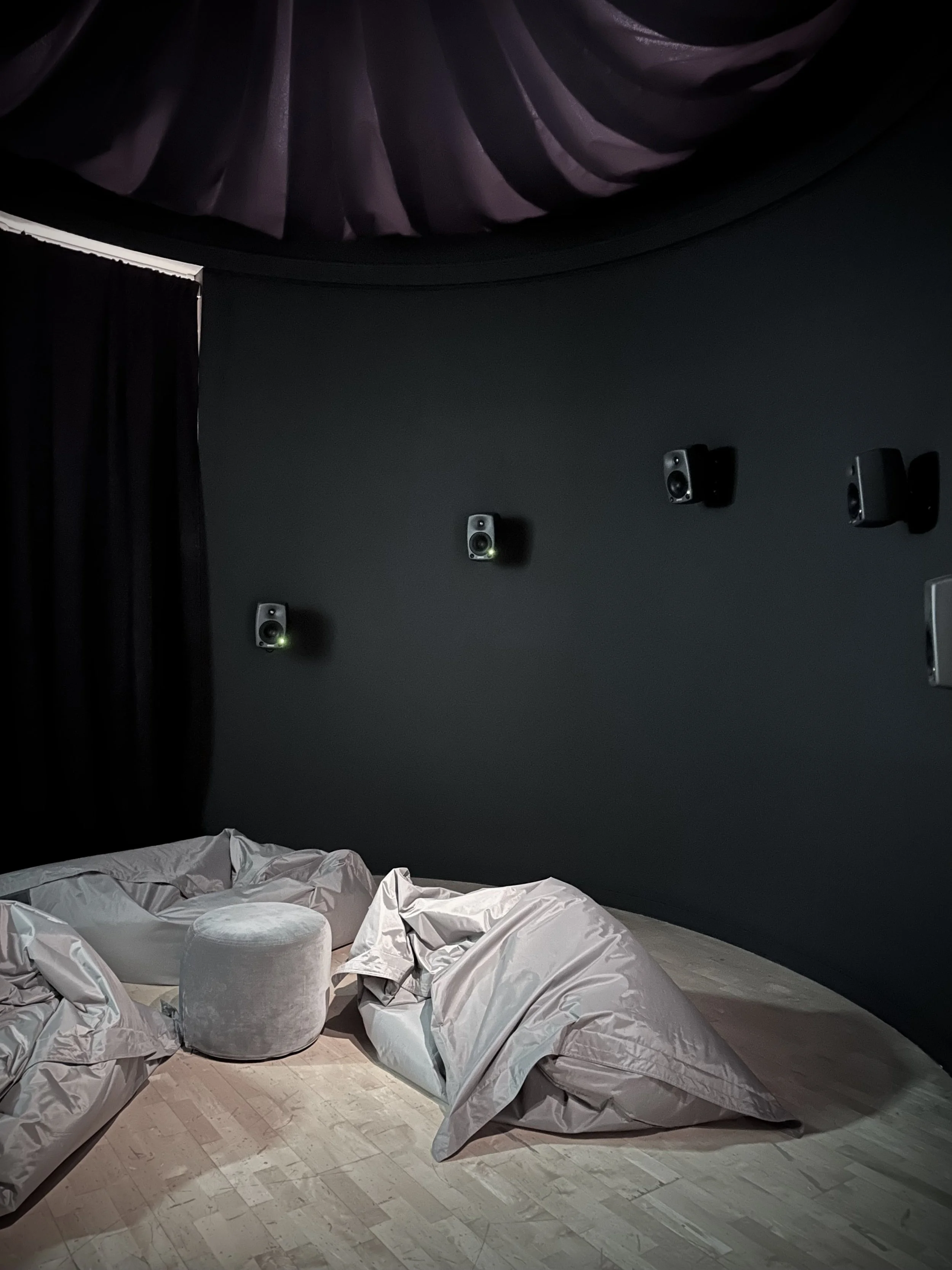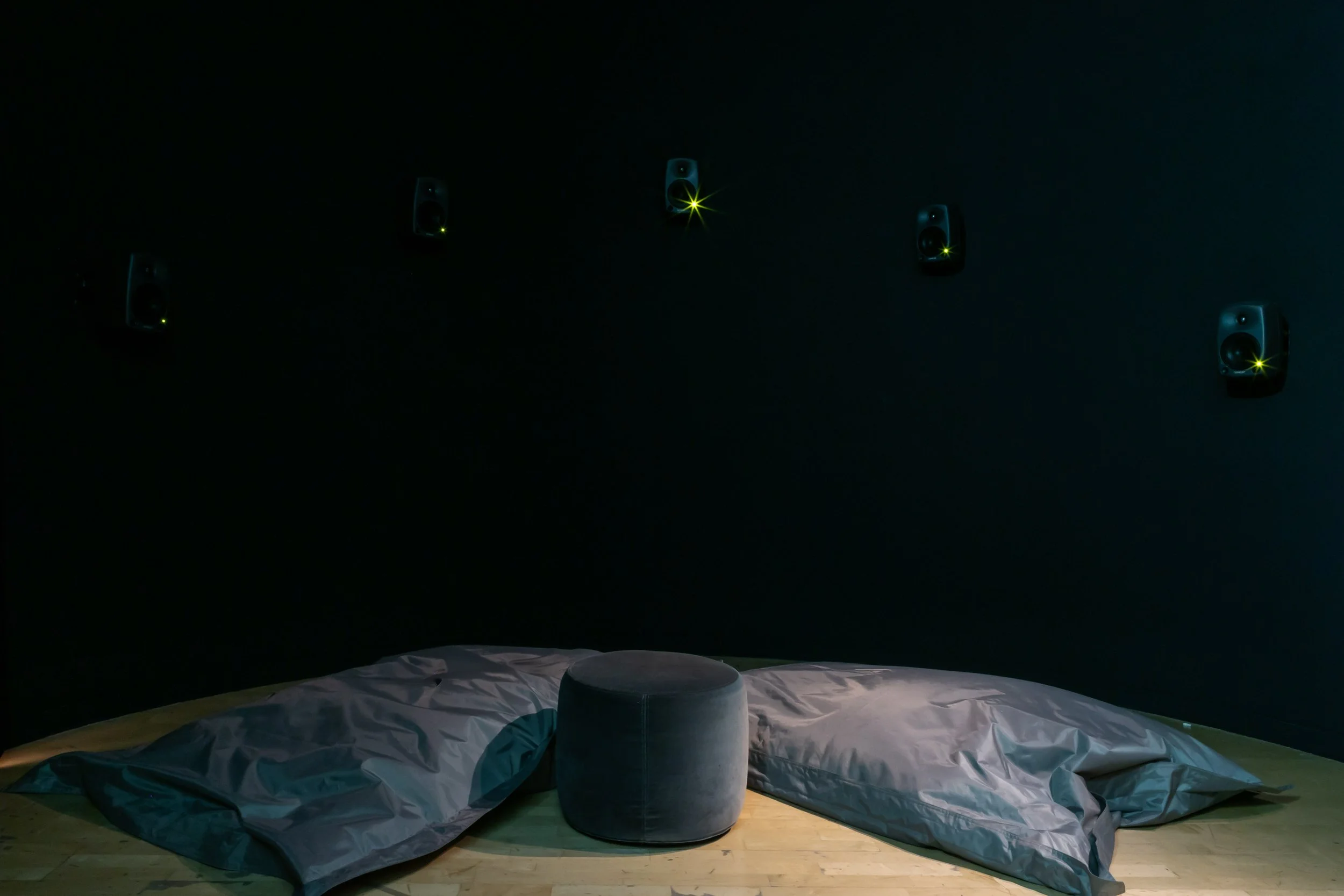The work is installed in the gallery’s round room where a circular configuration of speakers emphasises the dynamic, three dimensional movement of orbiting satellites. The low lighting and seating in the space is an invitation for visitors to enjoy a focused listening experience.